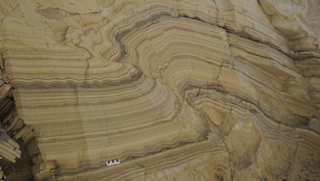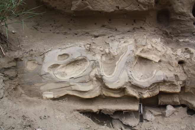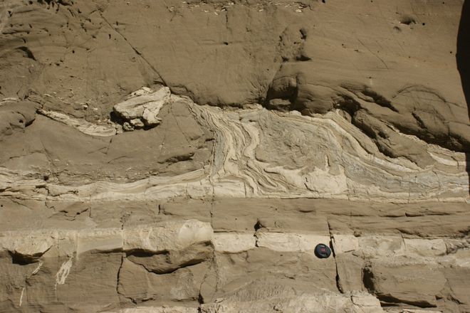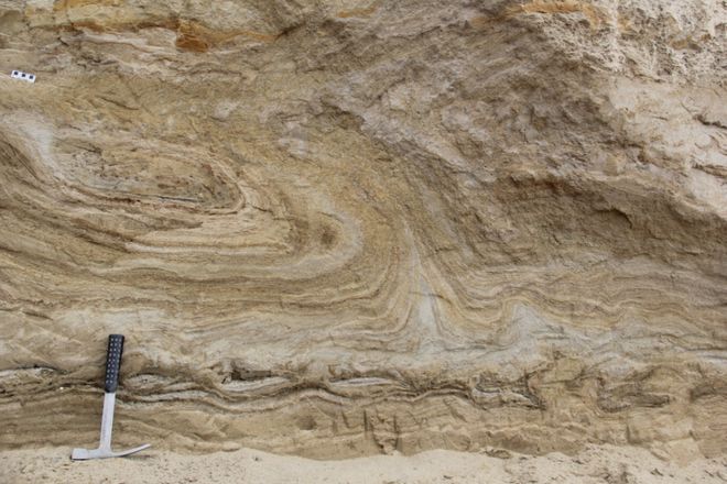 下伏的地层在受到上覆地层的超覆压力下,发生水平剪应力,使得细颗粒的纹泥发生卷曲或褶皱变形。这就好比蛋糕因受颠簸而发生变形的奶油层。