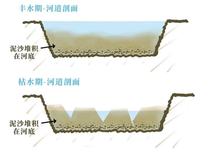 (1)洪水期:流量剧增,流速快,搬运能力强,能携带大量泥沙(尤其是粗沙砾石)向下游输送。