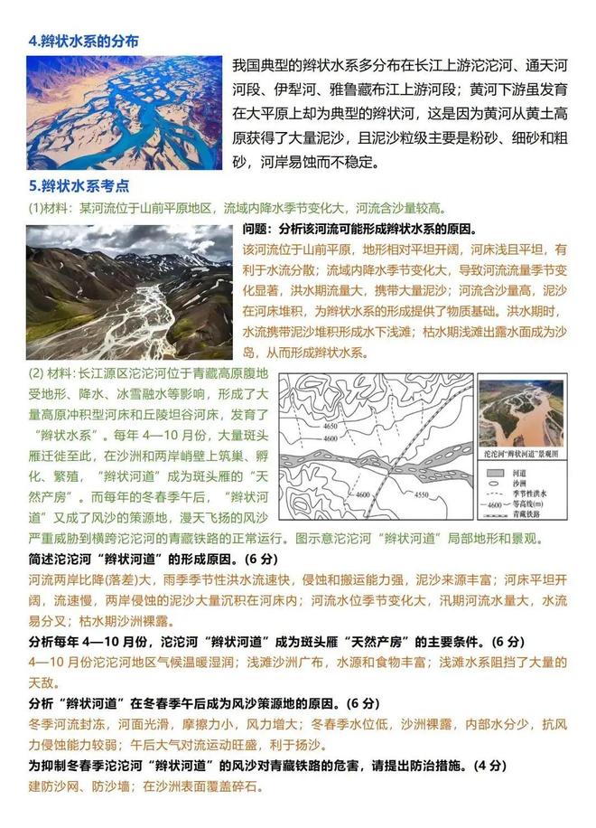 在高考地理中,“辫状水系”是一个重要的河流地貌概念,常出现在自然地理、水文地貌或区域地理相关的题目中。理解其形成原因、特征、分布及影响是解题的关键。